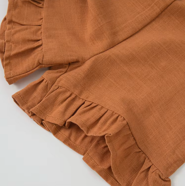 The Nancy Bodysuit Short is a classic summer piece in a beautiful rust tone, featuring tie-up shoulder straps and delicate frill detailing at the legs. Lightweight and easy to wear, it’s perfect for warm days, whether out and about or playing at home.