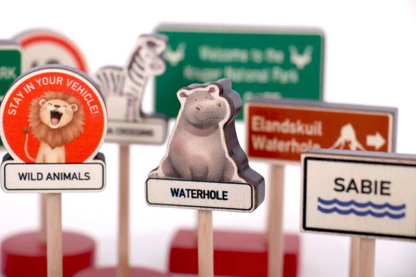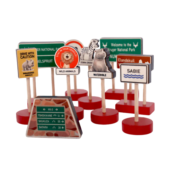 Inspired with South Africa's Kruger National Park in mind, these adorable mini road signs make car and road play much more fun. The mini-sized, yet realistic-looking signs will assist children in understanding the rules of the road from a young age.